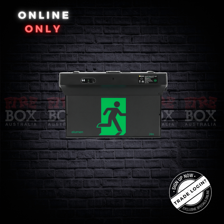 The Black Maslin is an LED surface -mount blade exit light with built in side LEDs (2 x D16) for emergency lighting coverage. This is our Self Testing (ST) model. This device is suitable for theatres.